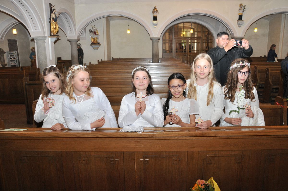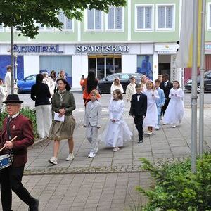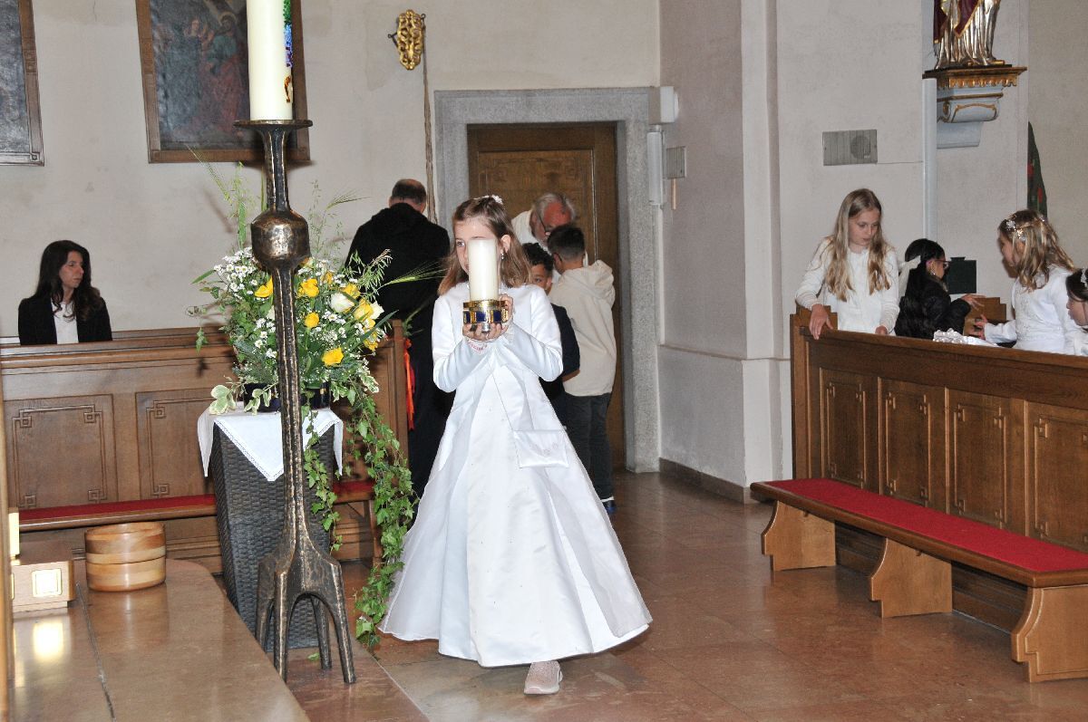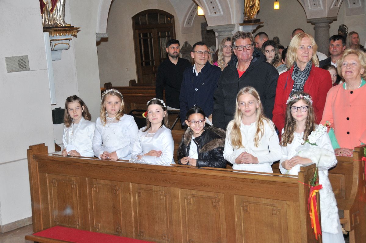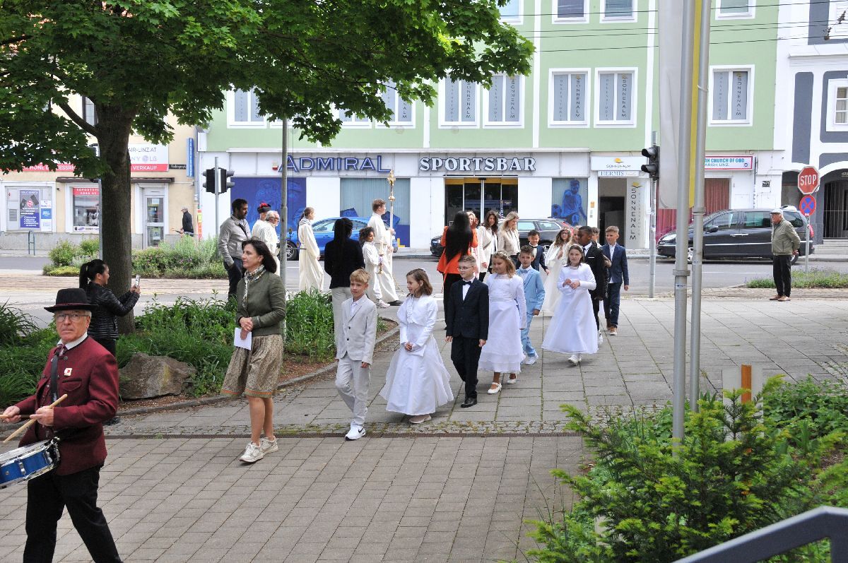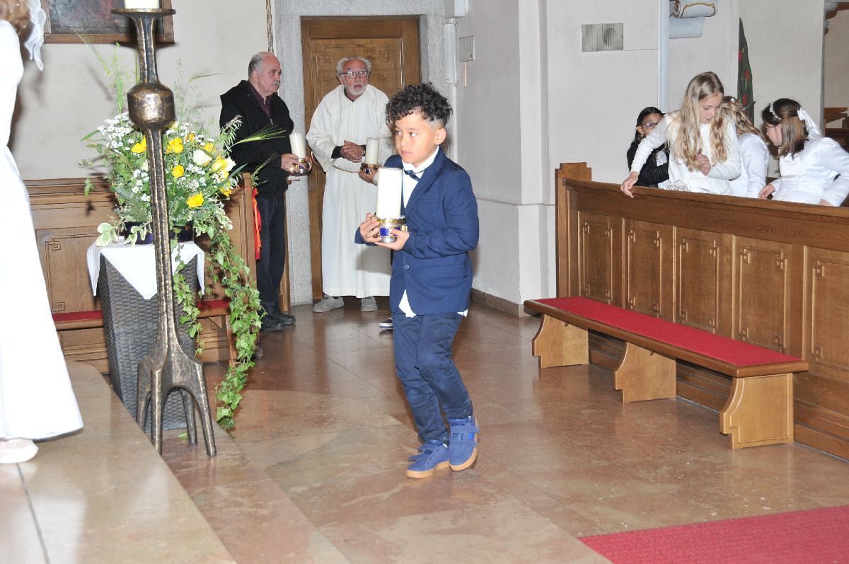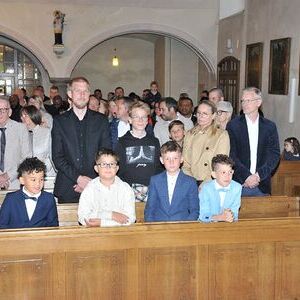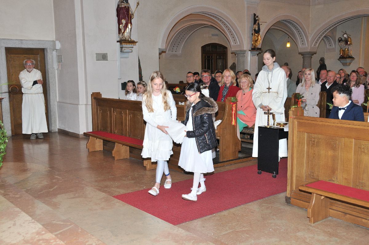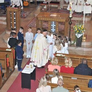 Unter den Klängen der Blasmusik zogen 13 ErstkommunikantInnen in die Pfarrkirche. Nach der Feier wurden von der Männerrunde Getränke, sowie Kaffee und Kuchen angeboten.