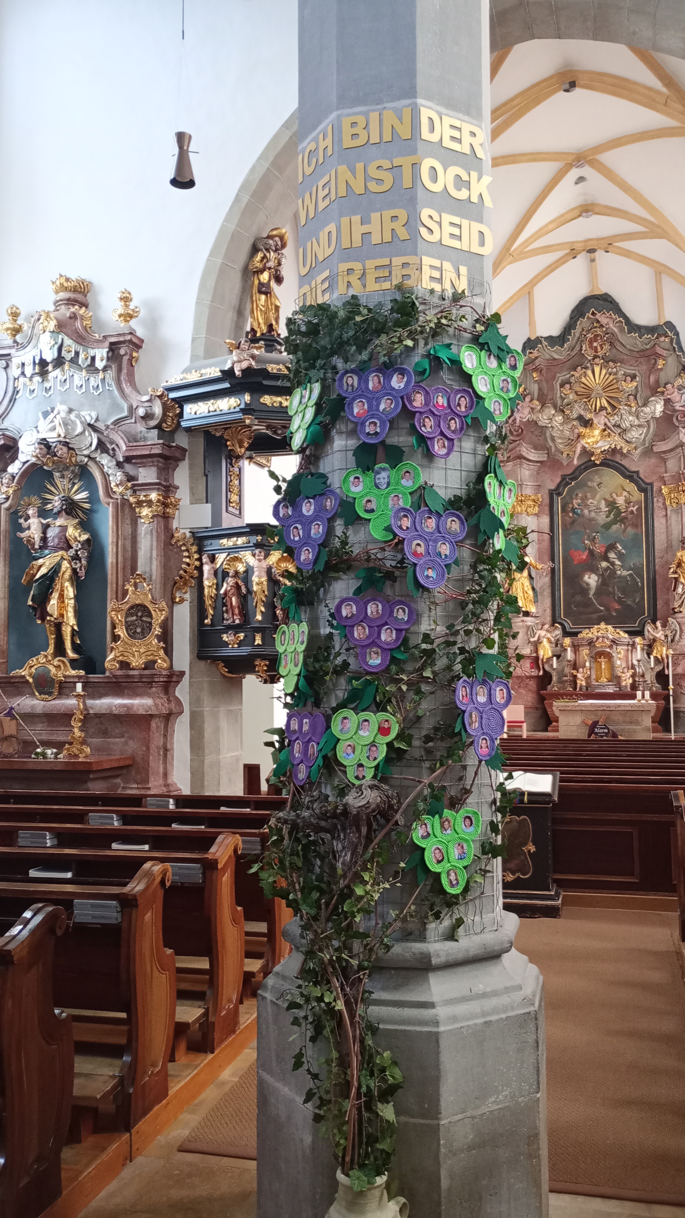 Wir beten und singen gemeinsam und nehmen uns Maria, die Mutter Jesu, als Vorbild. Nach dem Magnifikat, das wir ebenfalls gemeinsam singen und beten, sind alle Anwesenden eingeladen, einen dürren Ast zum Blühen zu bringen. Martina hat dazu Blüten und den Ast vorbereitet. Jede kann eine Blüte auf den Ast kleben und wer möchte dazu auch laut sagen, wofür ihre Blüte stehen soll, worauf sie hofft, für sich selbst, für die Welt, für die Kirche.